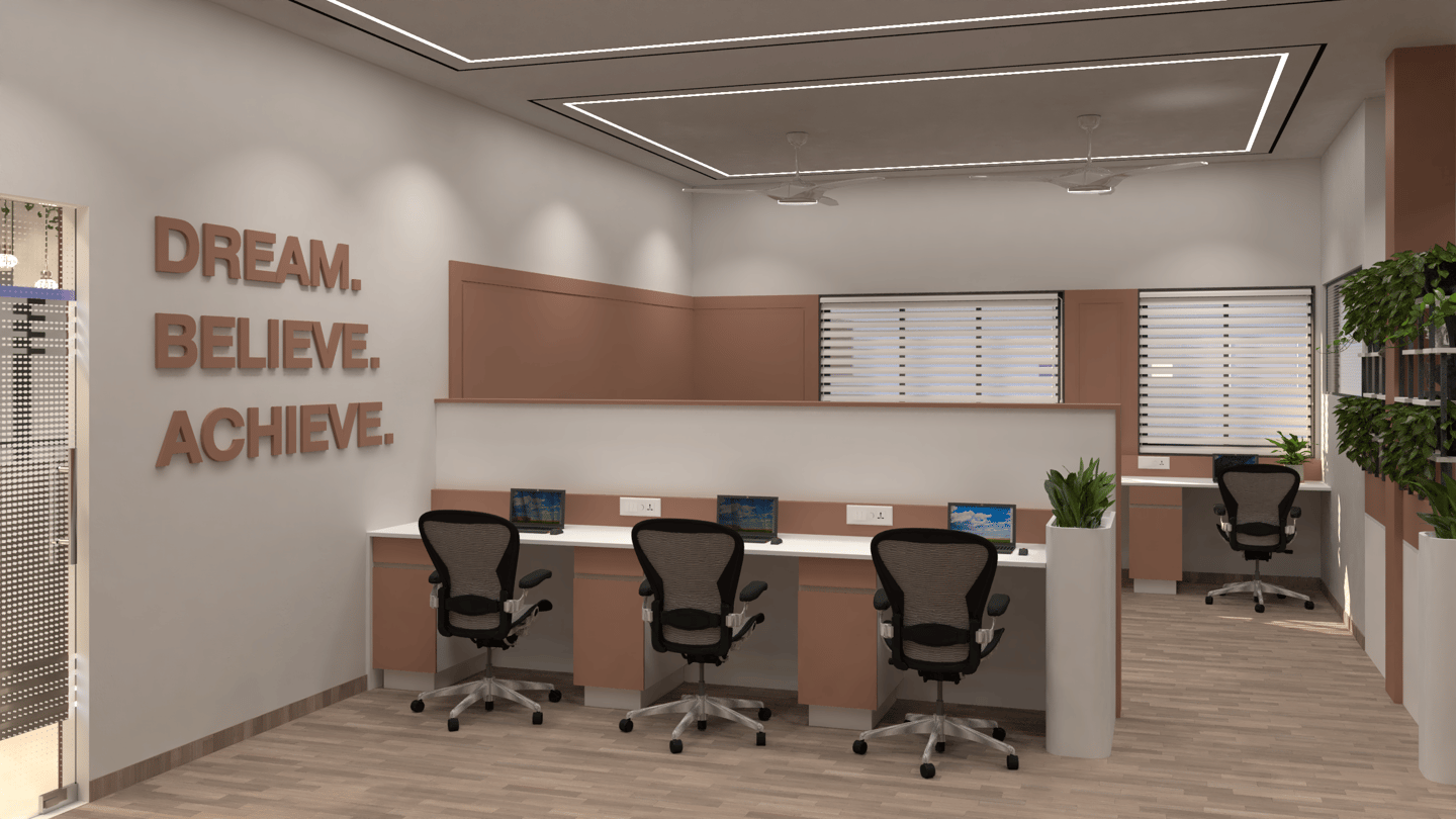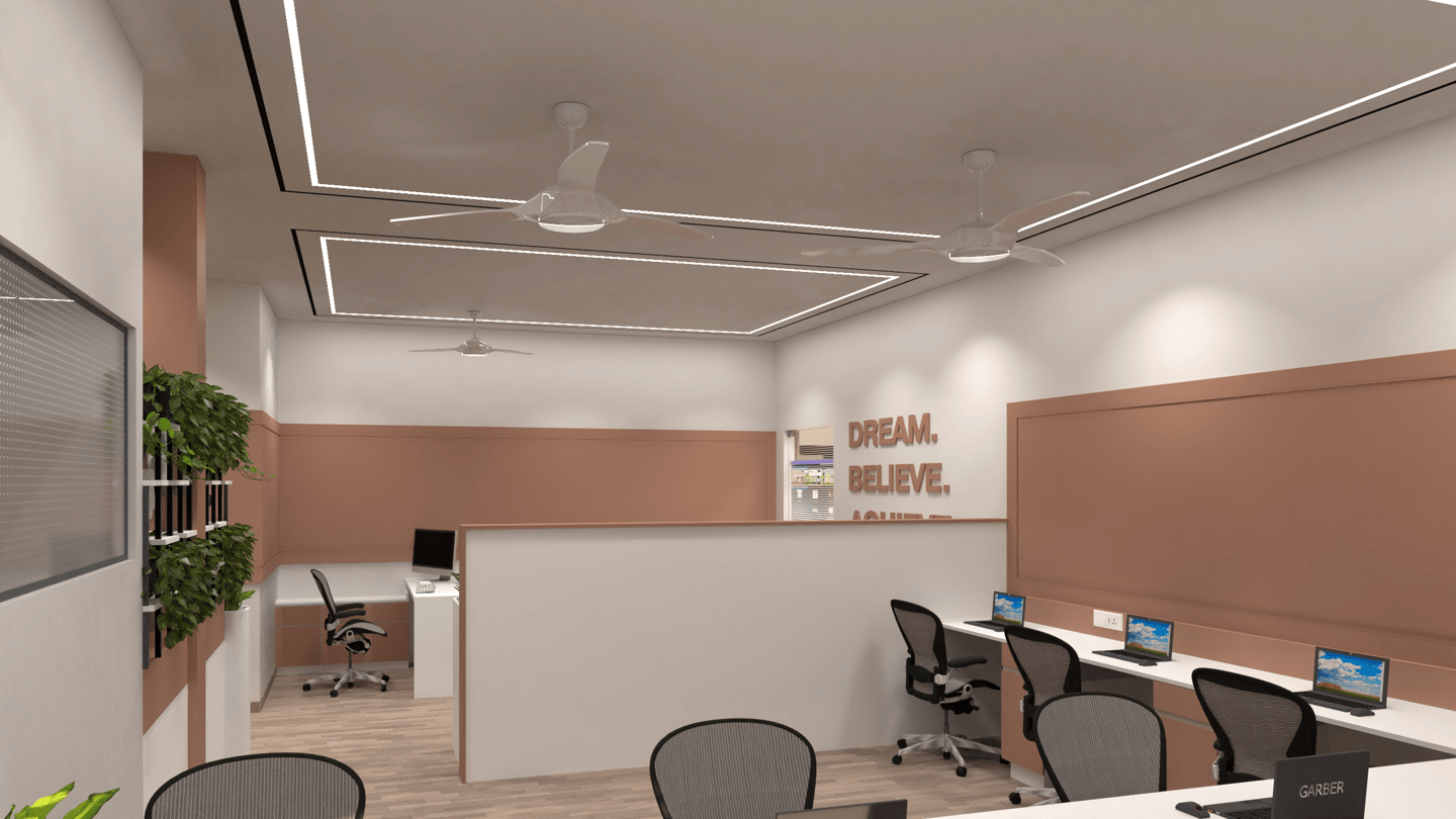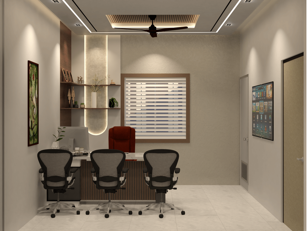 Indoor plants are introduced to soften the interiors and improve overall ambience. Acoustic considerations, ergonomic furniture, and smart zoning further contribute to a workspace that supports focus, collaboration, and comfort.