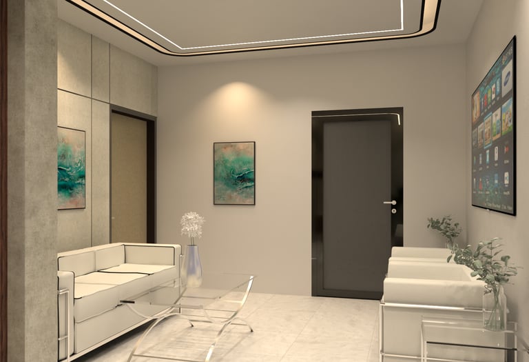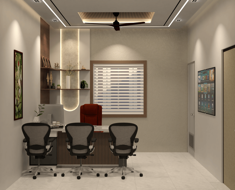 A neutral color palette forms the base of the design, complemented by warm wood finishes and subtle accent tones to add depth and character. Clean lines, minimal detailing, and a clutter-free approach give the office a contemporary and timeless appeal. Custom furniture and storage units were designed to maximize usability while maintaining a sleek aesthetic.